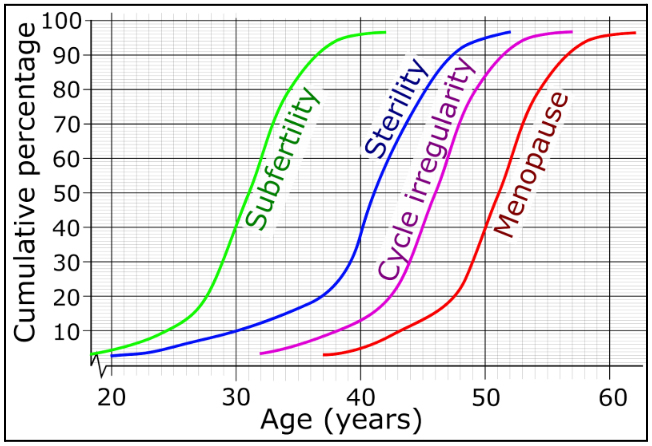 She is at her peak fertility throughout her early 20s and stays so in that decade. From the beginning of the thirties the egg pool started dwindling in number and quality. This reduction is rapid after the age of 35 and dramatic after 35 years of age. The lady will still continue to menstruate till she is menopausal, that is between the age of 45-50 years of age. However, the chance that she will conceive in the last 10 years of her reproductive life (40-50 yrs) is sometimes negligible.